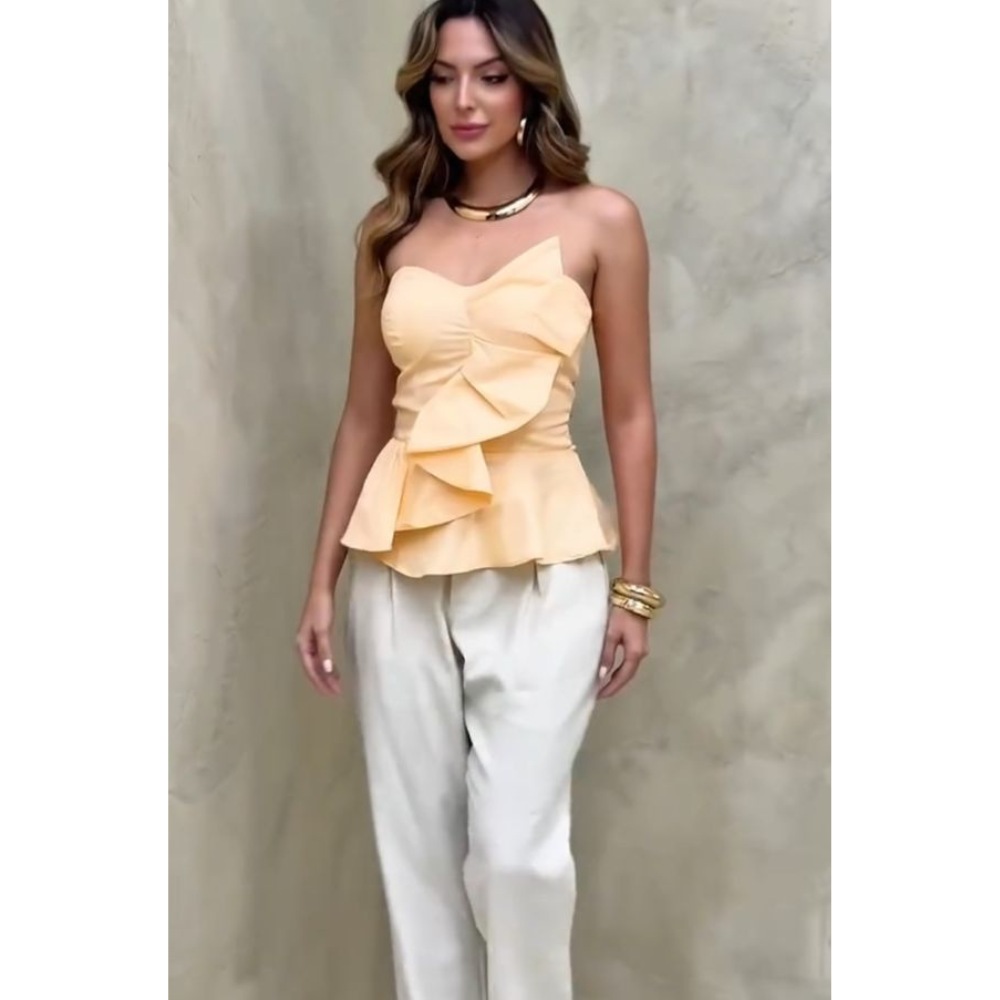 Blusinha tomara que caia charmosa e feminina, com bojo para melhor sustentação. Possui delicado babado na parte superior, parte de trás com elástico franzido que se ajusta ao corpo com conforto e fechamento lateral em zíper, garantindo praticidade e ótimo caimento. Perfeita para compor looks frescos e elegantes.