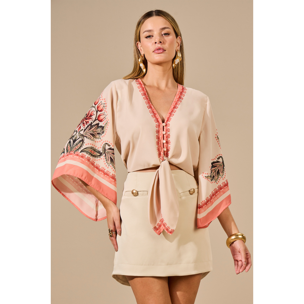 Blusa confeccionada em crepe, a peça apresenta mangas amplas, fechamento frontal por botões encapados e faixa para amarração, unindo elegância e praticidade. Conta ainda com estampa localizada, que valoriza o visual.