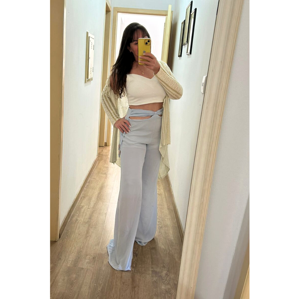 Confeccionada em poliéster , esta calça apresenta um recorte/abertura na cintura que valoriza a silhueta. O fecho é em zíper na parte posterior , garantindo acabamento discreto, e o cós traz cordões com pedraria nas pontas como detalhe sofisticado. Caimento confortável, ideal para looks do dia e da noite.