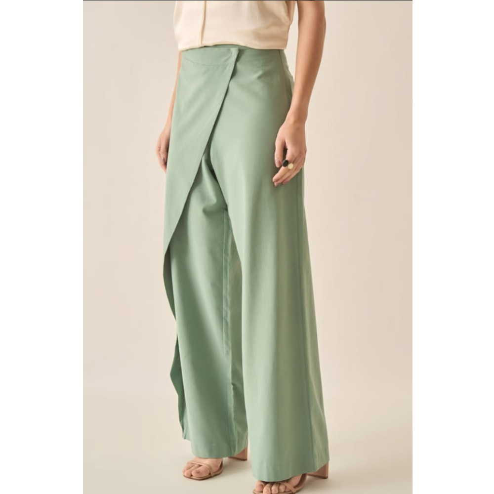 Calça pantalona sofisticada com modelagem transpassada que valoriza a silhueta e garante caimento elegante. Possui fechamento com zíper invisível, proporcionando acabamento clean e moderno. Confeccionada em tecido leve e fluido, é perfeita para compor looks formais ou combinações casuais com muito estilo.