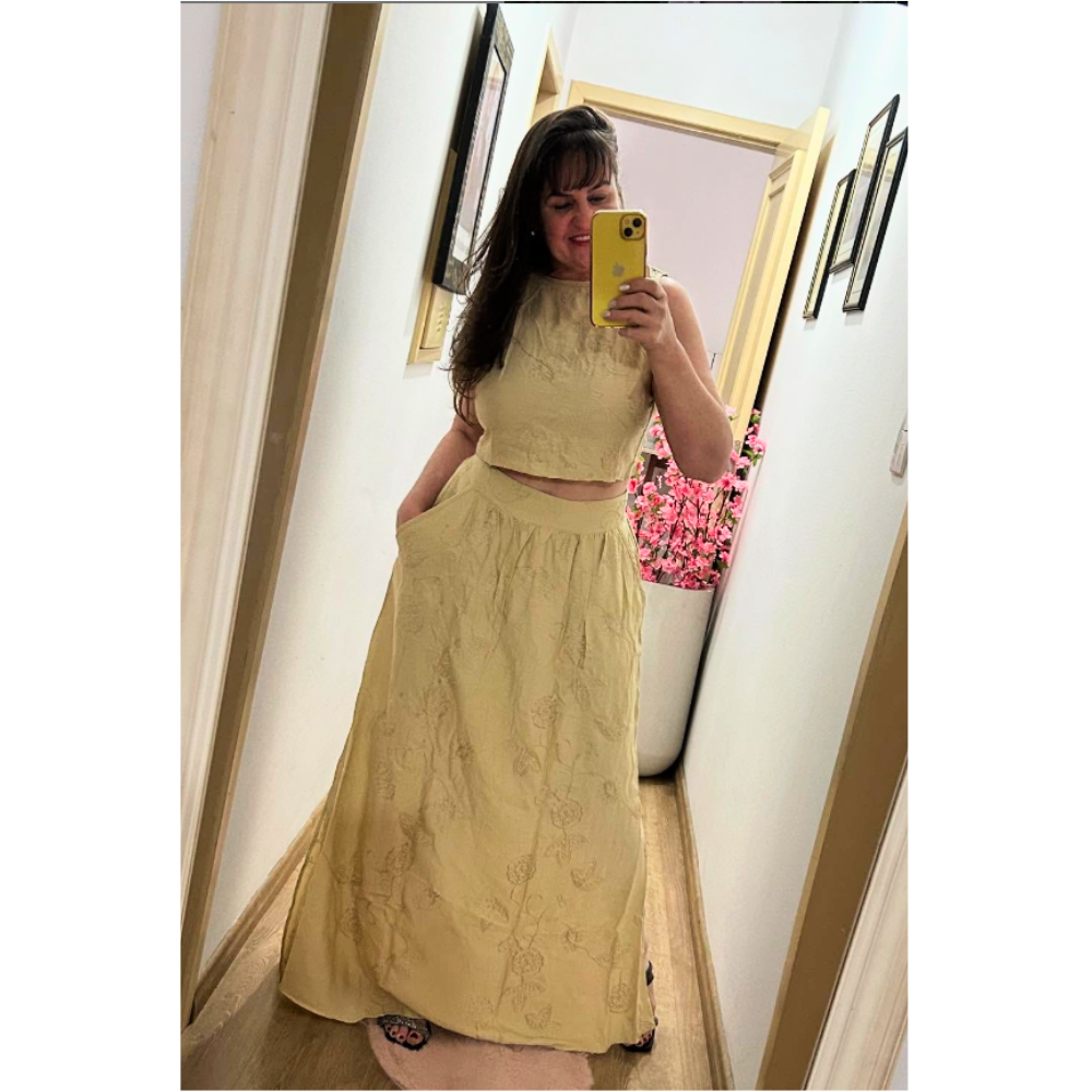 Delicado e elegante, este conjunto une modernidade e sofisticação em cada detalhe. A blusinha estilo cropped com decote em V valoriza o colo de forma feminina e charmosa, enquanto a saia longa fluida garante movimento e leveza ao look. O grande destaque fica por conta dos bordados feitos à mão, presentes em ambas as peças, que trazem exclusividade e um toque artesanal único. Confeccionado em tecido macio e confortável, é perfeito para ocasiões especiais que pedem um visual marcante e sofisticado.