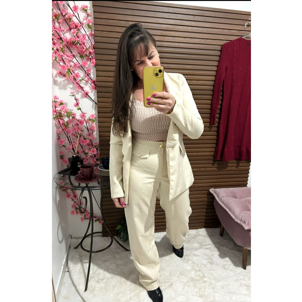 Conjunto elegante de calça e blazer em alfaiataria, com listras fininhas em prata que adicionam um toque de brilho sutil e sofisticação à peça. Com modelagem impecável e tecido estruturado, oferece um caimento refinado que valoriza a silhueta. Ideal para ocasiões especiais ou para elevar o visual do dia a dia com estilo moderno e atemporal.