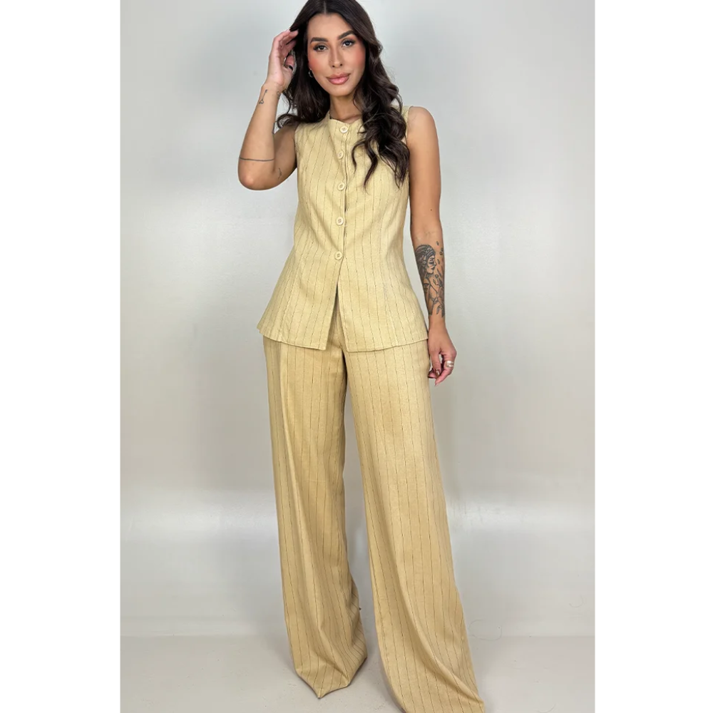 Conjunto em linho misto com elastano, tecido com elasticidade, aspecto rústico do linho, caimento leve e toque macio. Composto por colete alongado e calça pantalona, a estampa risca de giz e a modelagem conferem as peças uma estética clássica e sofisticada inspirada na alfaiataria feminina. O colete alongado com corte levemente acinturado, possui decote redondo, recorte em linha princesa, transpasse com cinco botões e acabamento em viés nas cavas. A calça em corte pantalona, contém abertura em braguilha, passantes e bolsos faca.