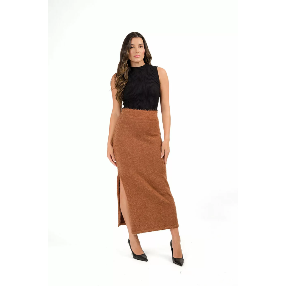 Saia confeccionada em poliéster e poliamida, com toque macio e acabamento externo com leves pelinhos que adicionam textura e charme à peça. A fenda discreta traz movimento e um toque de sensualidade na medida certa. Moderna e elegante, é perfeita para compor looks sofisticados e confortáveis nos dias mais frescos.