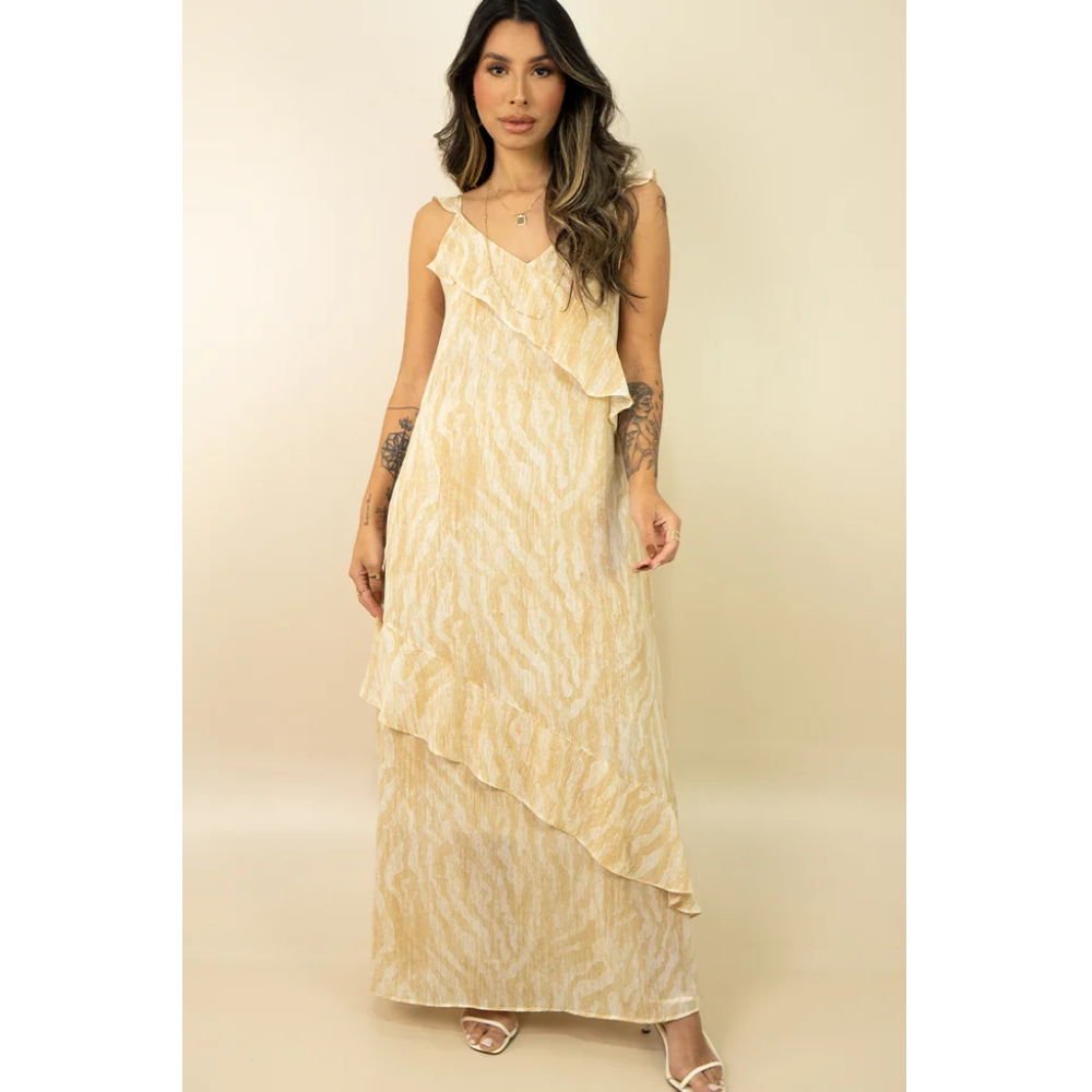 Vestido longo em crepe estampado, tecido com caimento leve e fluido. A peça contém forro e segue modelo de alcinhas com aplicação de babado godê e ajuste em amarração nas costas. Com decote em V, um babado godê é aplicado em diagonal, criando um ponto de assimetria. O corte segue em desenho evasê com leve acinturado, gerando volume e movimento para a peça. Na saia um recorte é unido com babado godê, também em diagonal. A aplicação de babados em pontos específicos das peças e caimento do tecido criam uma estética romântica, que evoca movimento, feminilidade e delicadeza.