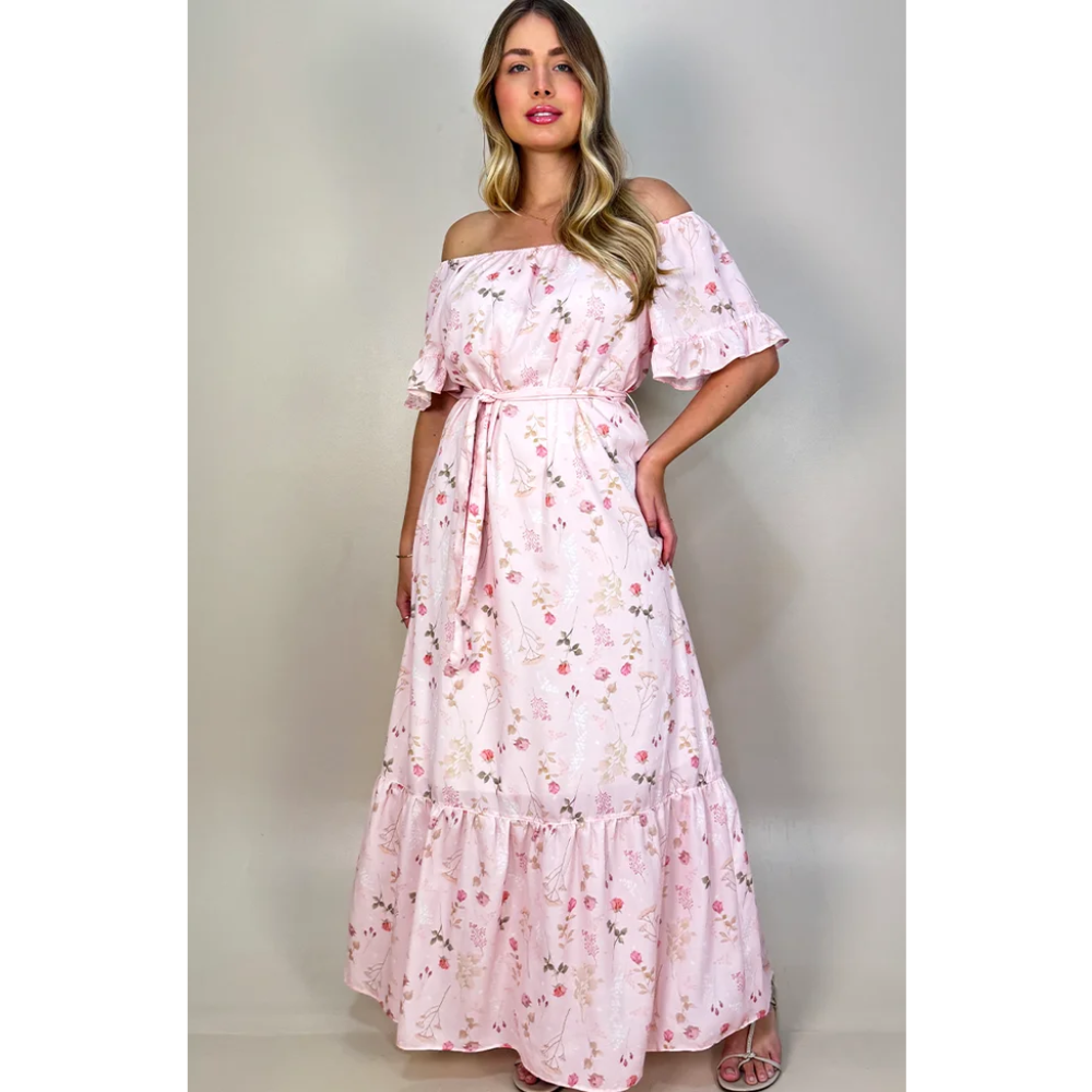 Vestido longo em crepe estampado, tecido com caimento leve e fluidez. Com estampa floral exclusiva em tons suaves, inspirada nos campos, leveza e delicadeza do verão. A peça possui corte evasê com leve acinturado, decote quadrado franzido e mangas soltinhas com barra em babado franzido. A barra do vestido em babado franzido traz leveza e movimento a peça. Contém forro, passantes discretos na lateral da cintura e acompanha uma faixa larga.