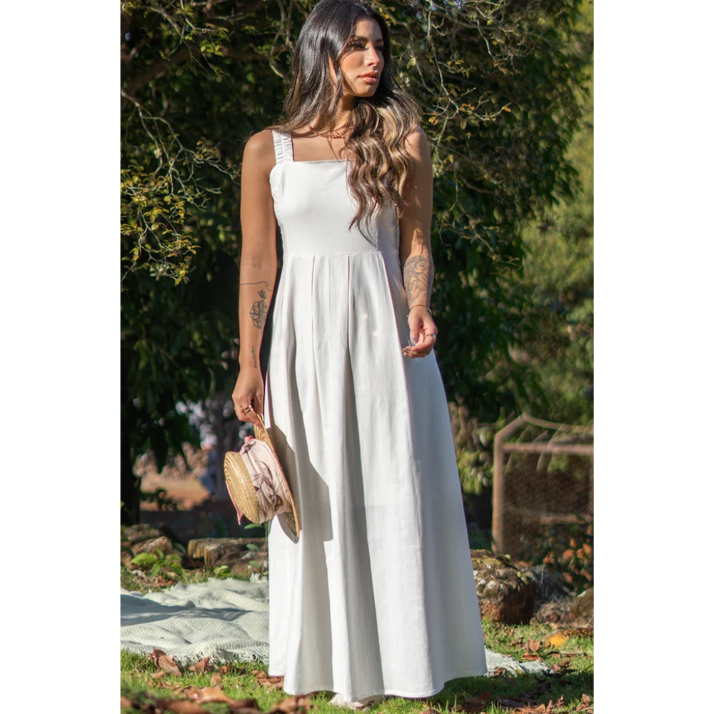 Vestido longo em linho misto com elastano, tecido com elasticidade, aspecto rústico de fibras naturais, caimento leve e toque macio. Possui a parte superior até o baixo busto com modelagem mais ajustada, com decote reto e recorte anatômico frente e costas. A saia segue a partir de recorte com corte evasê e quatro pregas fêmeas na frente e costas, criando volume. As alças largas possuem elástico embutido, criando textura ondulada, e ajuste em argolas meia lua nas costas. Contém forro.